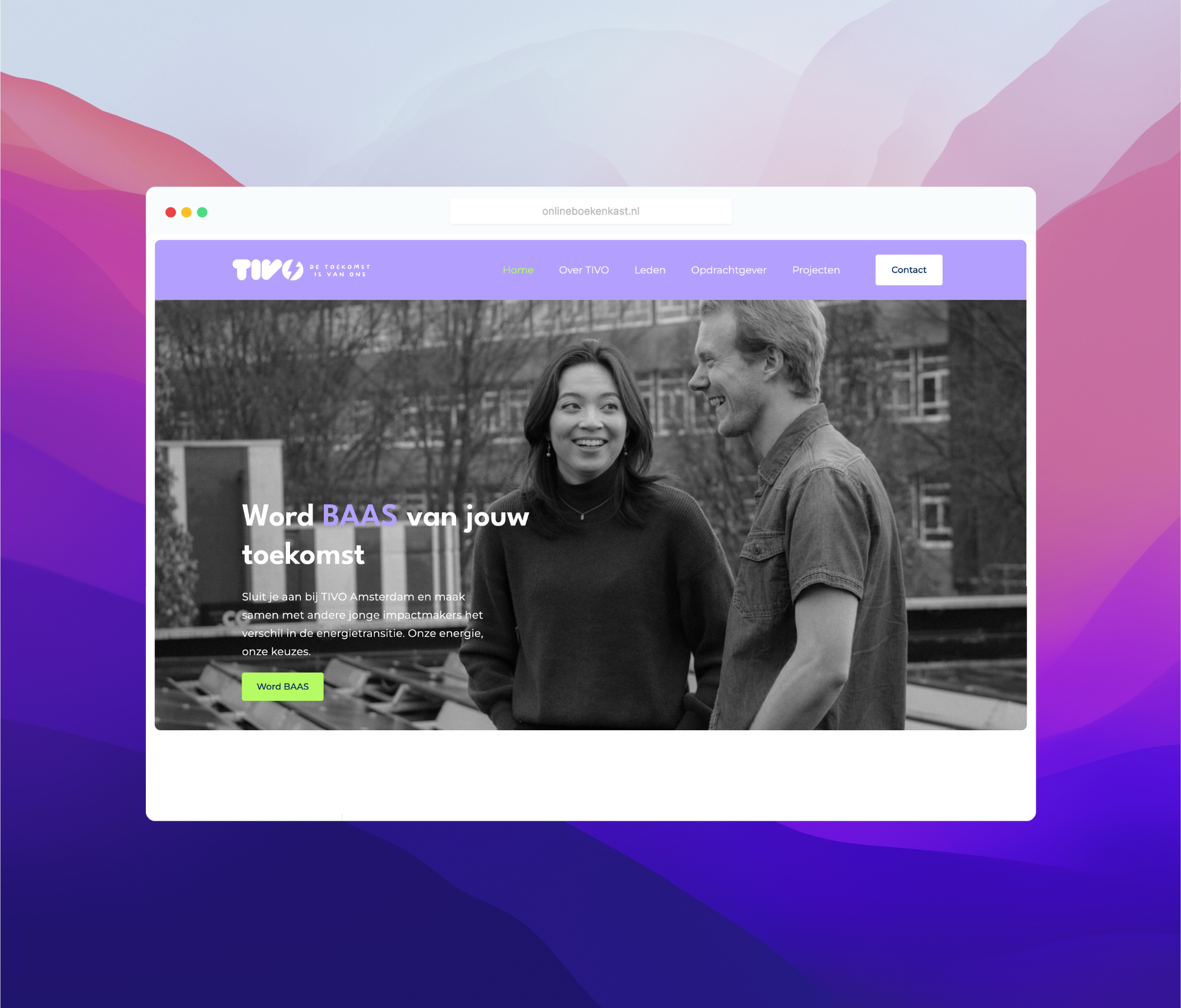 TIVO is een energiecoöperatie waar jongeren samenkomen om eigenaarschap te nemen in de energietransitie. Met de slogan "Word BAAS van jouw toekomst" inspireert TIVO jonge professionals om samen te werken aan duurzame projecten en creatieve oplossingen te bieden voor de energietransitie.